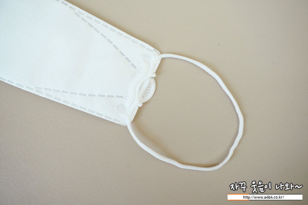 둥근 모양의 귀걸이끈이 사용된 KF94 와이제이씨엠투 마스크의 가장 큰 매력은 바로 귀걸이끈 조절기능입니다. 끈 길이는 넉넉하며 장력은 일반적인 수준입니다. 뉴네퓨어 마스크등과 비슷한 방식으로 끈조절이 가능합니다.