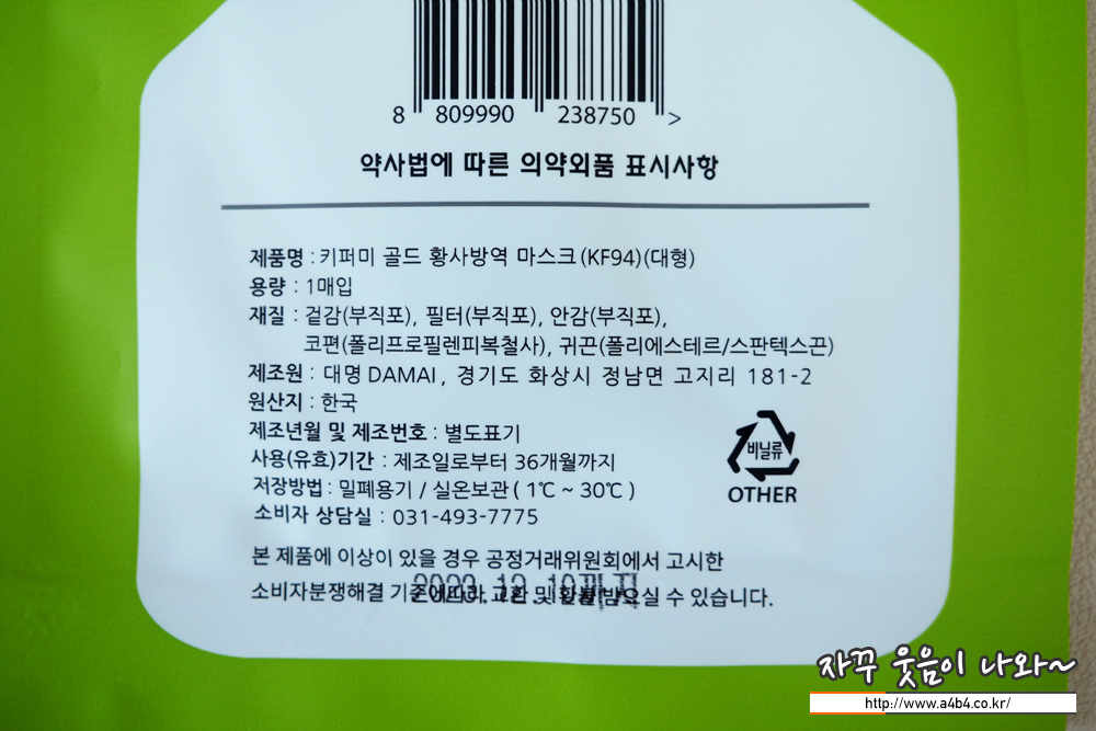 식품의약품안전처 의약품안전나라 등록명칭은 '키퍼미 골드 황사방역 마스크 (Kf94)'입니다. 흰색 대형 제품으로 작년 11월 승인된 마스크입니다. 마스크 제조원은 '대명디에이엠에이아이' 입니다.