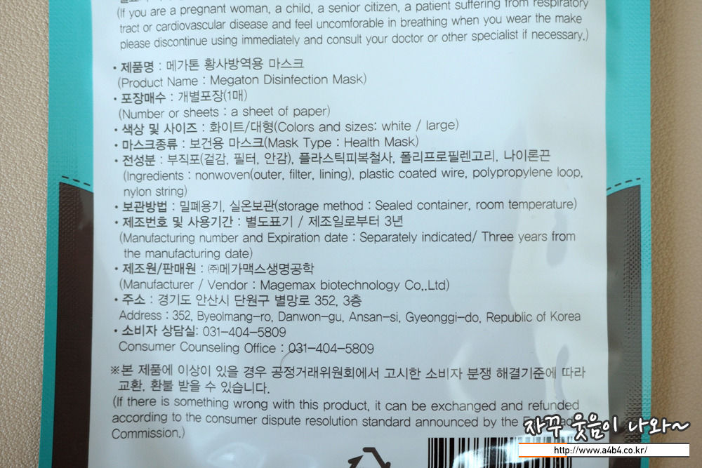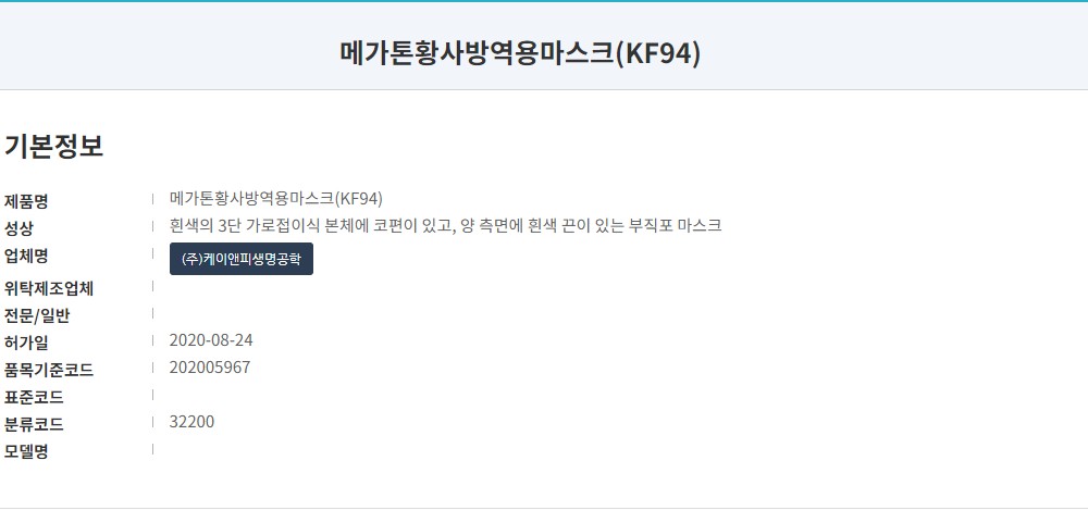 식약처 등록명은 '메가톤황사방역용마스크 (KF94)'로 흰색 대형 마스크입니다. 작년 8월에 식약처 승인된 제품으로 제조원 및 판매원은 (주)메가맥스생명공학으로 표시되어 있습니다. 안산시 단원구 반월국가 산업단지에 위치한...