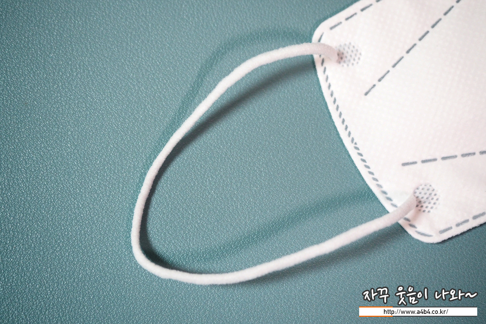 둥근 모양의 귀걸이끈이 마스크 앞면에 부착되어 있으며, 귀걸이끈의 탄성은 보통입니다.