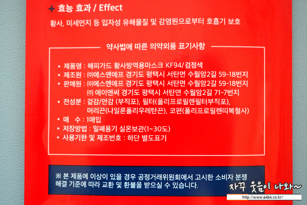 제조사 안내에 따르면 해피가드 마스크 블랙 대형 원자재는 100% 국내산을 사용했다고 합니다. (이렇게 명학하게 안내하는 제품도 많지 않네요. 맨날 made in korea만 강조하는데 비해서 믿음은 가네요)