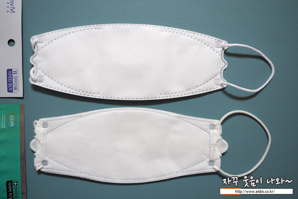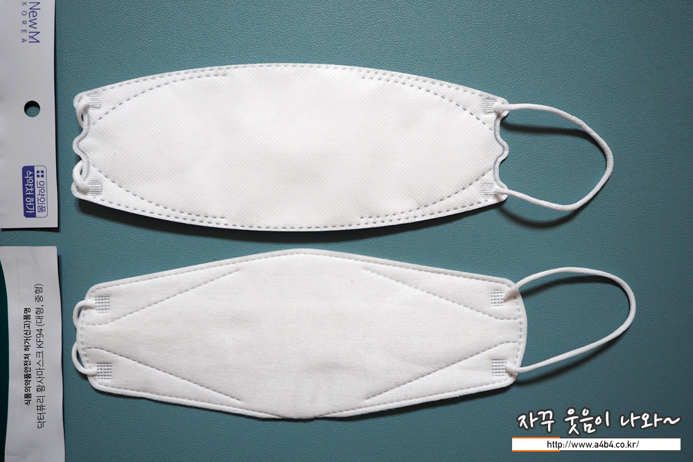 마스크 디자인인 일반적인 가로 삼단접이식 3D 스타일 입체형 마스크 모양을 보여줍니다. 뉴엠 마스크의 특징인 양쪽 끝 이어밴드 접합 부위의 튀어나온 3개의 뿔이 보이네요. 어떤 깊은 뜻이 있는지는 모르겠지만 착용감에는 영향 없는 것 같습니다.