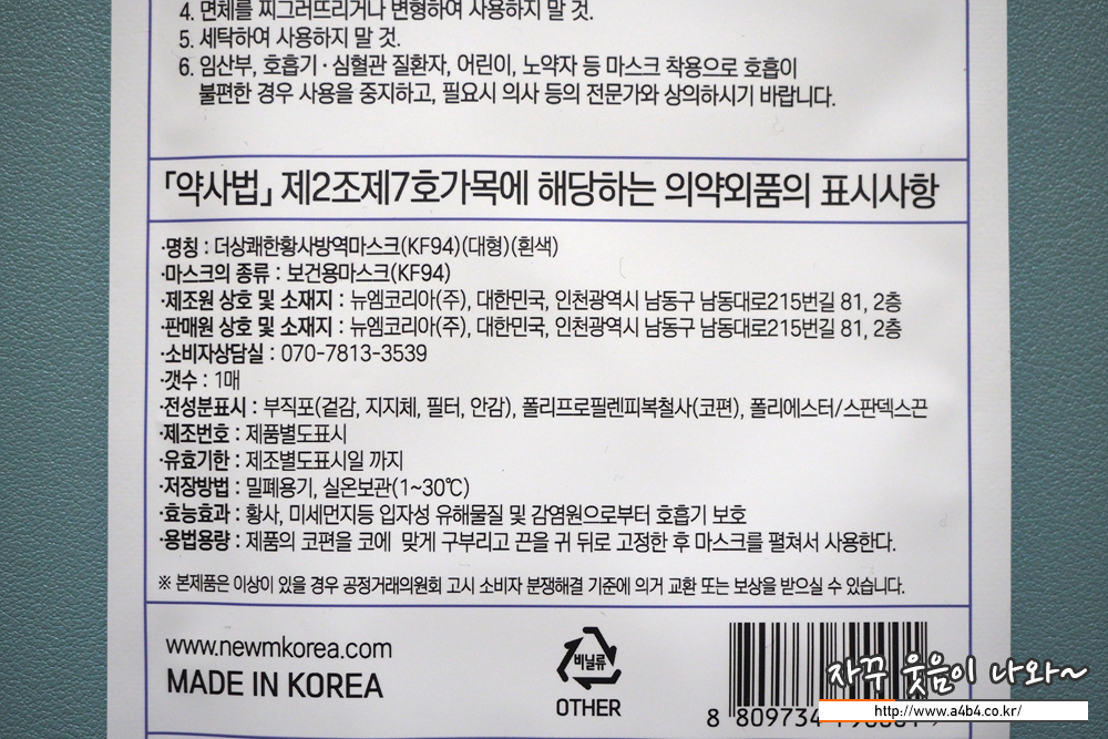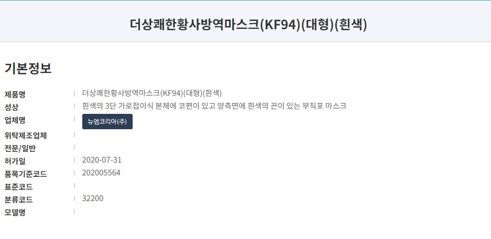 식품의약품안전처 의약품안전나라 등록명칭은 '더상쾌한황사방역마스크'로 KF94 타입 대형 사이즈의 제품입니다. 작년 7월 허가된 마스크로 제조원은 '뉴엠코리아(주)'입니다.