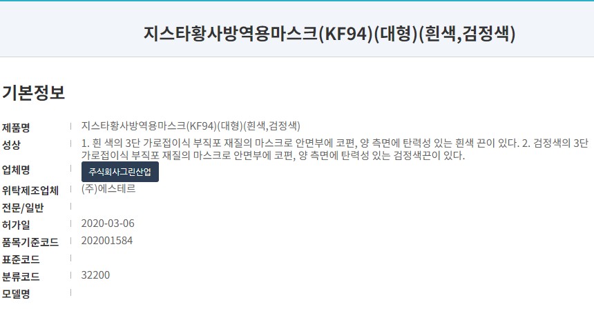식품의약품안전처 의약품안전나라 등록 명칭은'지스타 황사방역용마스크'로 KF94 타입, 블랙 대형 마스크입니다. 제조원은 '(주)에스테르' 제조의뢰원은 (주)그린산업 입니다. 유통은 셀로긴에서 진행합니다. 작년 3월에 승인된 제품