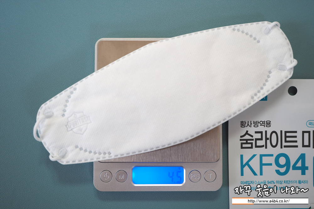 KF94 숨라이트 마스크 대형 무게는 4.5그램으로 일반 대형 사이즈 마스크와 비슷한 무게입니다.