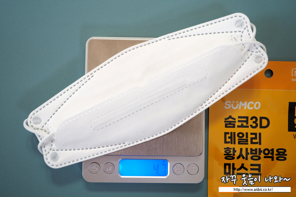 숨코 3D 마스크 대형 무게는4.7g으로 일반적인 대형 마스크 무게를 보여줍니다.