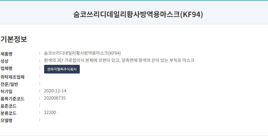 식품의약품안전처 의약품안전나라 등록 제품명은 '숨코3D 황사방역용마스크'입니다. 오늘 리뷰할 제품은 대형사이즈로 작년 12월 허가된 제품입니다. 마스크 제조사는 천하지엘씨 주식회사'로 숨코 브랜드로 여러 타입의 마스크를 생산하고 있습니다.