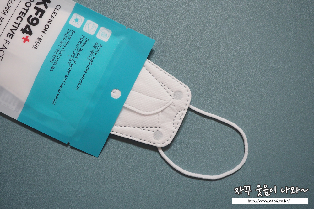 KF94 클린온 마스크는 원형의 귀걸이끈이 마스크 앞면에 접착되어 있으며 귀걸이끈 탄력은 타사 제품과 비슷합니다.