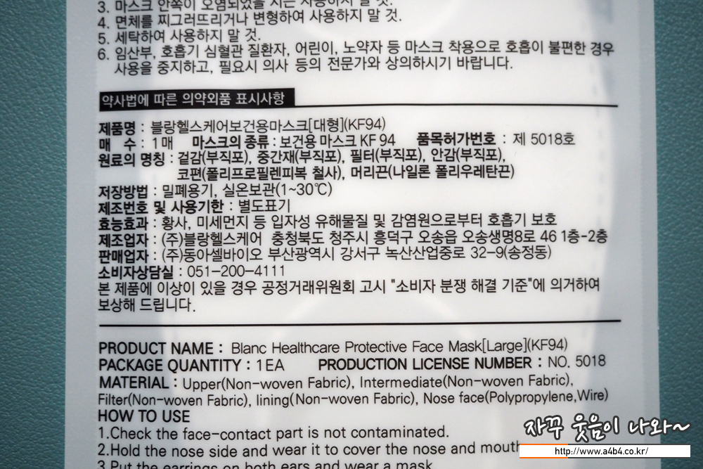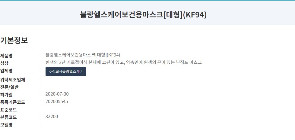 식품의약품안전처 의약품안전나라 등록 명칭은 '블랑헬스케어보건용마스크 KF94'입니다. 대형, 흰색 제품으로 작년 7월에 승인된 제품으로 마스크 제조업자는 '주식회사블랑헬스케어', 판매업자는 '동아셀바이오'로 등록되어 있습니다.