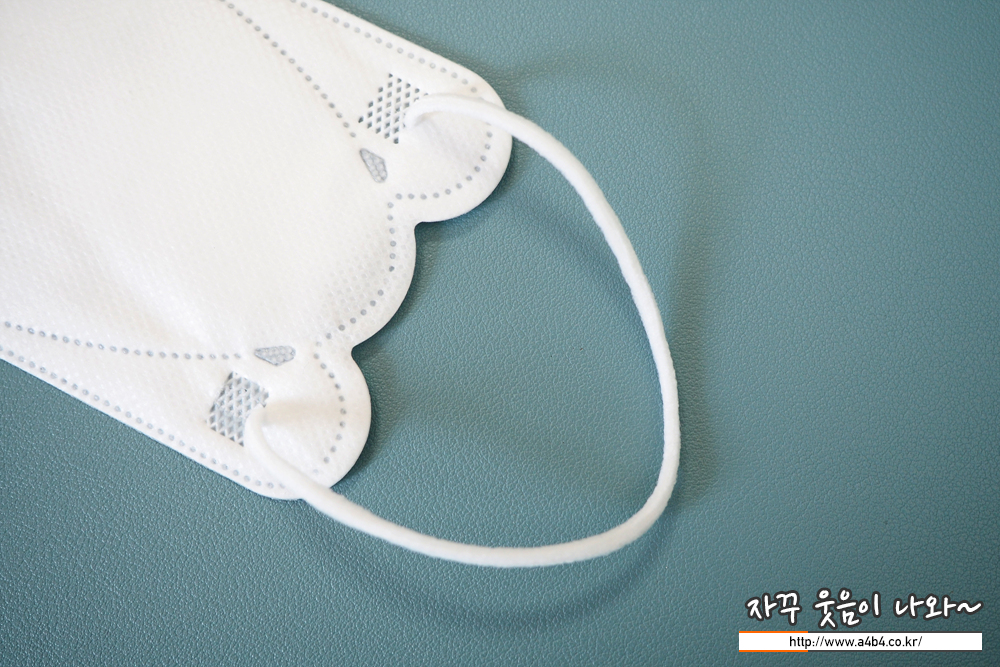 마스크 앞면에는 원형의 귀걸이끈이 접착되어 있습니다. 귀걸이끈 탄성은 조금 약한 수준이네요. (잘 늘어난다는...)
