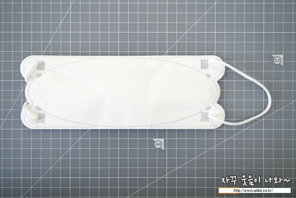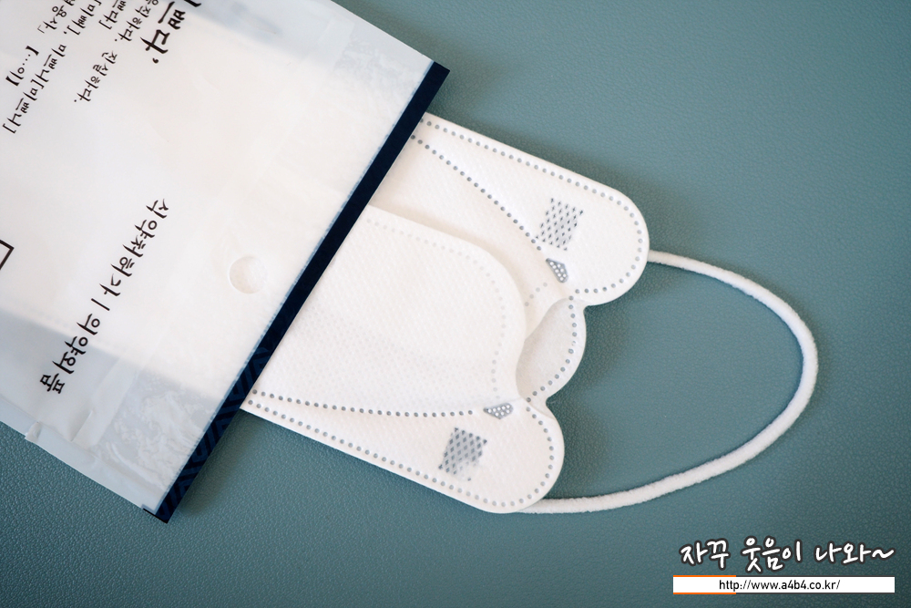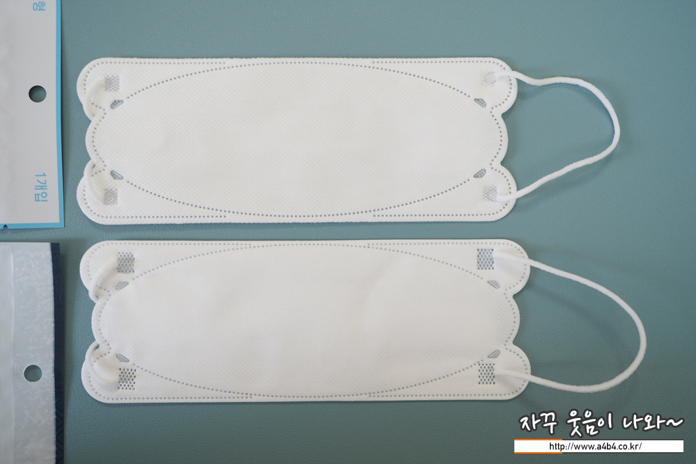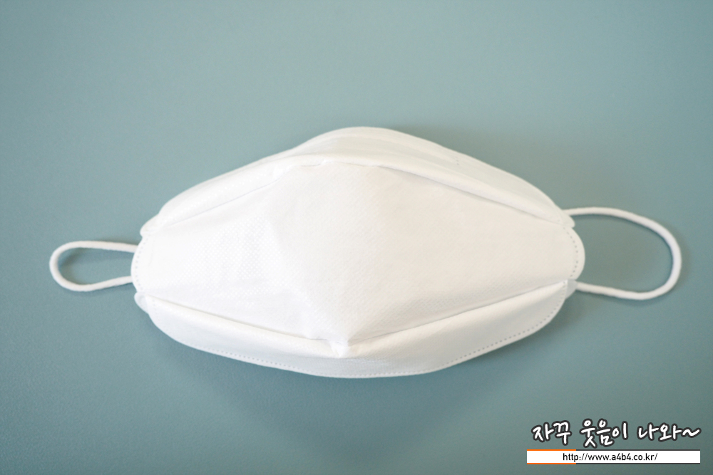 마스크 모양은 사각에 가까운 가로 삼단접이식 입체형 마스크입니다. 타사 제품과 다른 부분은 중앙과 양쪽 끝부분의 높이가 같은 사각형에 가까운 디자인으로 이어밴드 사이의 간격이 최대한 확보되게 설계되어 있습니다. (이 부분은 장단점이 있겠죠 ^^)
