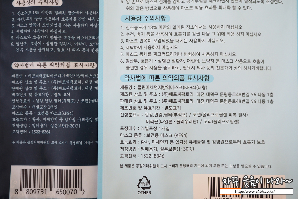 아마도 마스크에 사용된 원재료의 차이는 확인할 수 없지만, 외형과 등록정보만 봐서는 동일한 제품이 아닐까 추측합니다. 온라인 쇼핑몰에서 판매되는 가격도 두 제품 차이가 거의 없습니다.