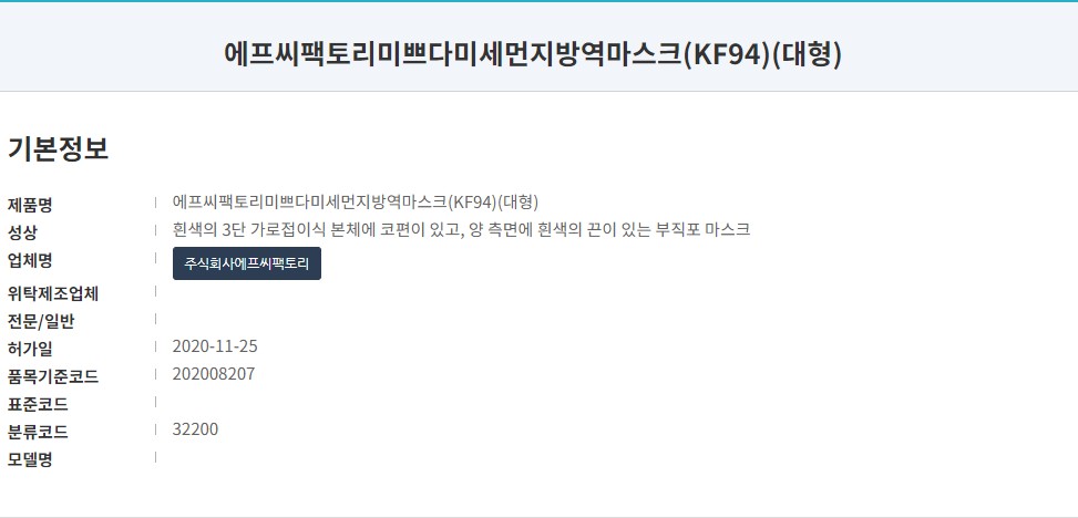 식품의약품안전처 의약품안전나라 등록명은 '에프씨팩토리 미쁘다 미세먼지 방역마스크'로 KF94타입 대형사이즈 마스크입니다. 작년 11월에 승인된 제품으로 마스크 제조업체는 '주식회사 에프씨팩토리'입니다.