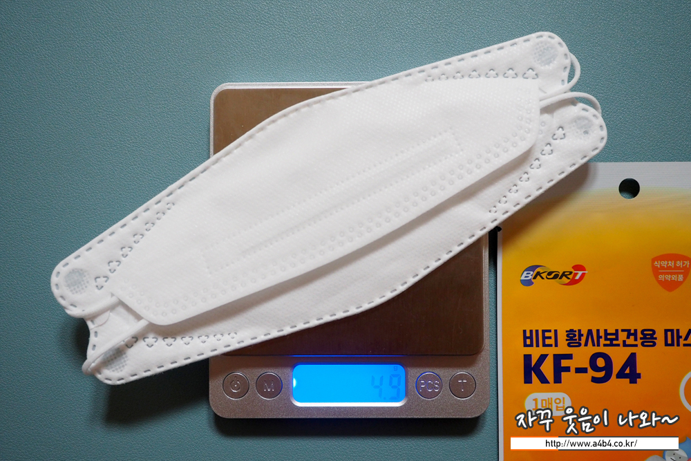마스크 중량은 4.9g으로 다른 KF94 대형사이즈 마스크와 비스한 중량을 보여줍니다.