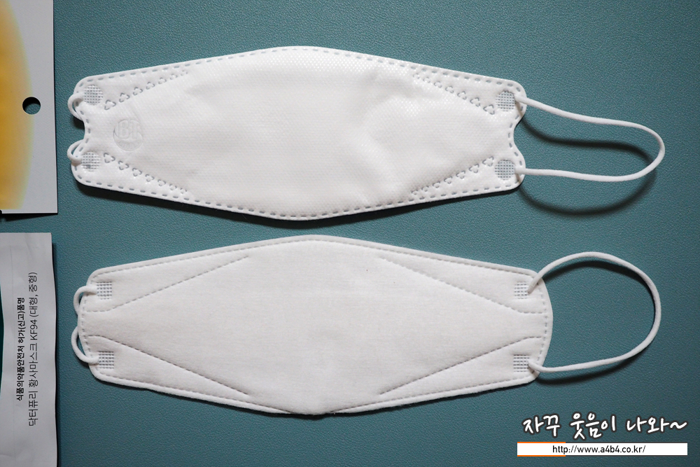 비티 황사보건용마스크 대형 외피는 매끄러운 감촉의 부직포가 적용되었으며, KF94 제품중에서는 얇은 스타일로 소프트한 착용감을 보여줍니다.