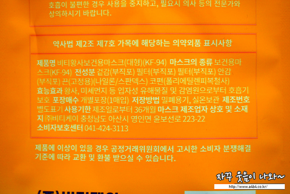 식품의약품안전처 의약품안전나라 등록명칭은 '비티황사보건용마스크'로 KF94, 대형입니다. 작년 9월 승인된 제품으로 마스크 제조원은 '(주)비티케이'입니다. '비티' 상표의 마스크를 주로 생산하고 있습니다.