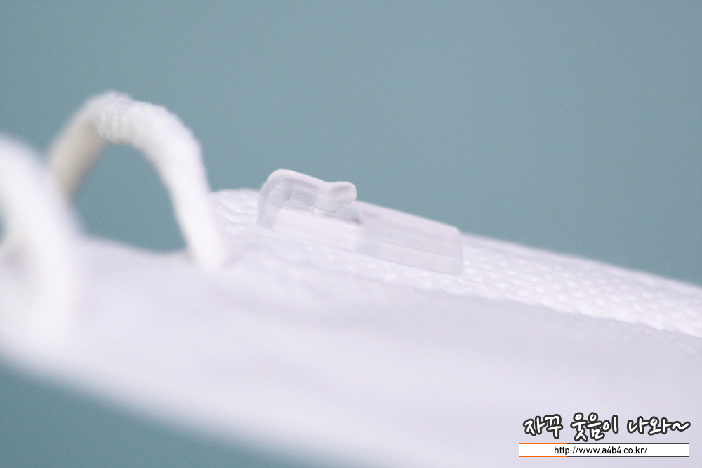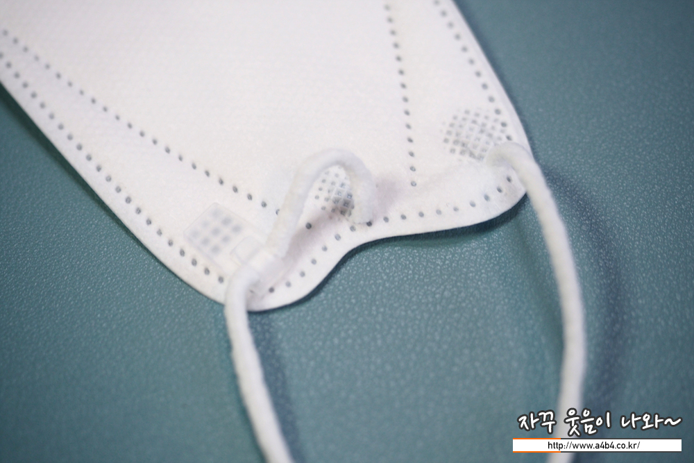 에버그린 황사방역용 마스크 대형은 독특한 방식의 끈길이 조절이 가능한 제품입니다. 원형의 어어밴드가 사용되었으며, 전면에 플라스틱 팁이 부착되어 있어 후크 방식으로 이어밴드를 걸어서 끈길이를 조절하는 방식입니다.