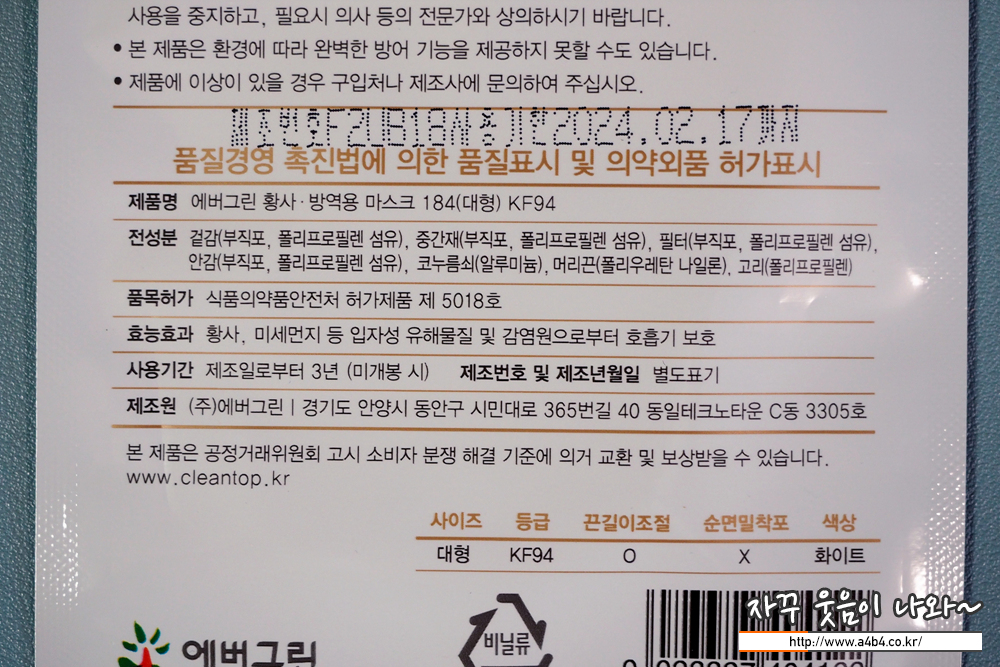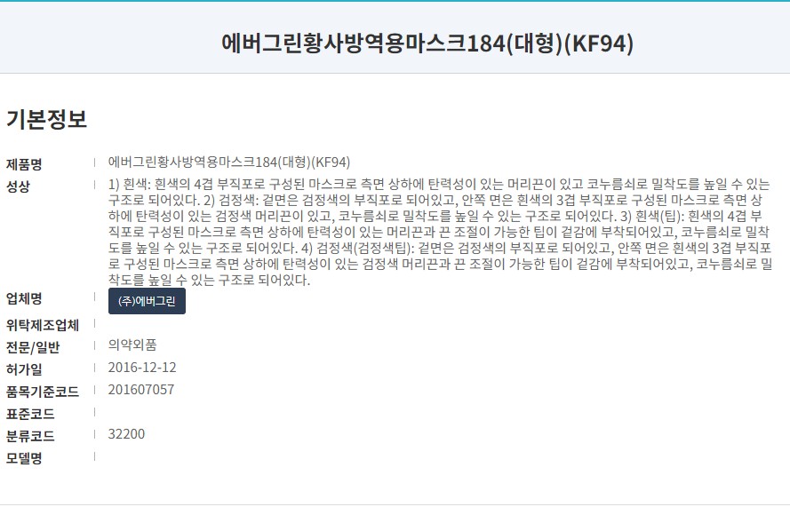 식품의약품안전처 의약품안전나라 등록명은 '에버그린 황사 방역용 마스크 184 (대형)'입니다. 흰색의 KF94 제품으로 5년 전인 16년 허가된 제품입니다. 크린탑 마스크 제조사는 (주)에버그린으로 동일 모델에서 끈조절이 가능한 마스크입니다.