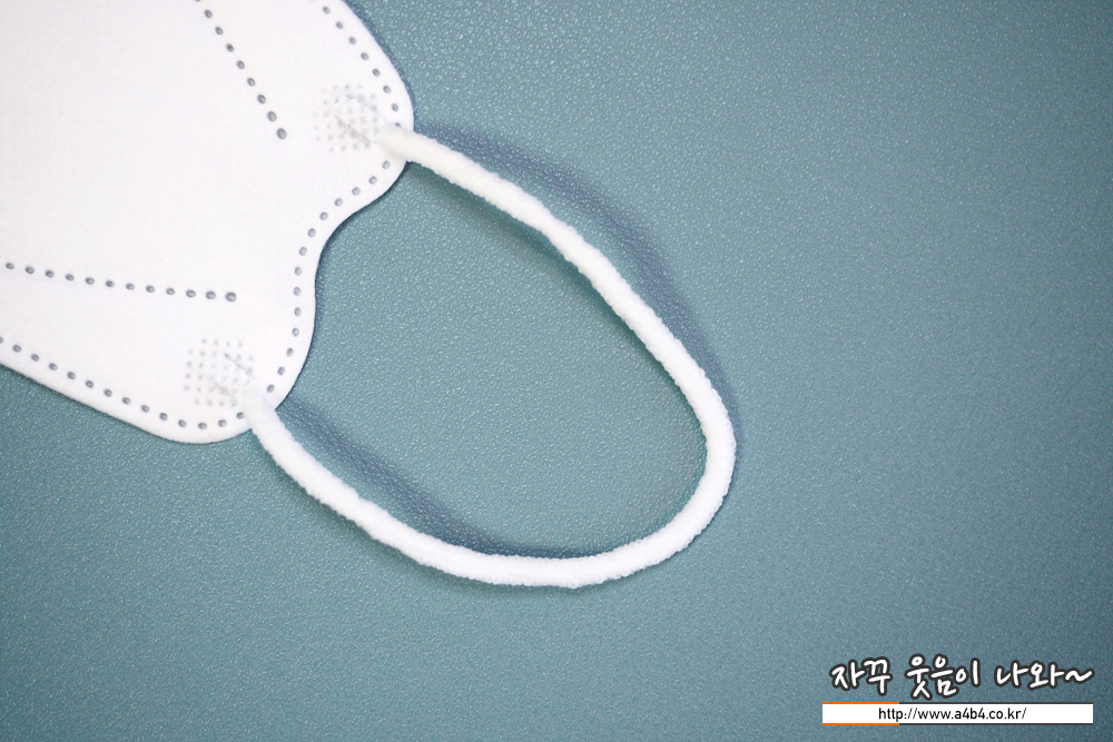 둥근모양의 귀걸이끈이 마스크 앞면에 부착되어 있으며, 부착 상태는 양호합니다. 귀걸이끈 탄성은 잘 늘어나는 약한 타입입니다