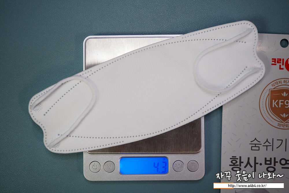 KF94 에버그린 황사마스크 대형 무게는 4.3그램으로 대형사이즈 마스크 중에서는 상대적으로 가벼운 무게입니다.