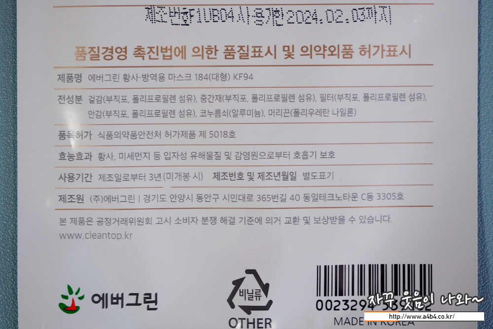 식품의약품안전처 의약품안전나라 등록명은 '에버그린황사방역용마스크184'입니다. KF94, 흰색 대형 제품으로 16년 12월에 허가된 마스크입니다. 제조원은 주힉회사 에버그린으로 정말로 다양한 제품이 등록되어 있는 제조사입니다.