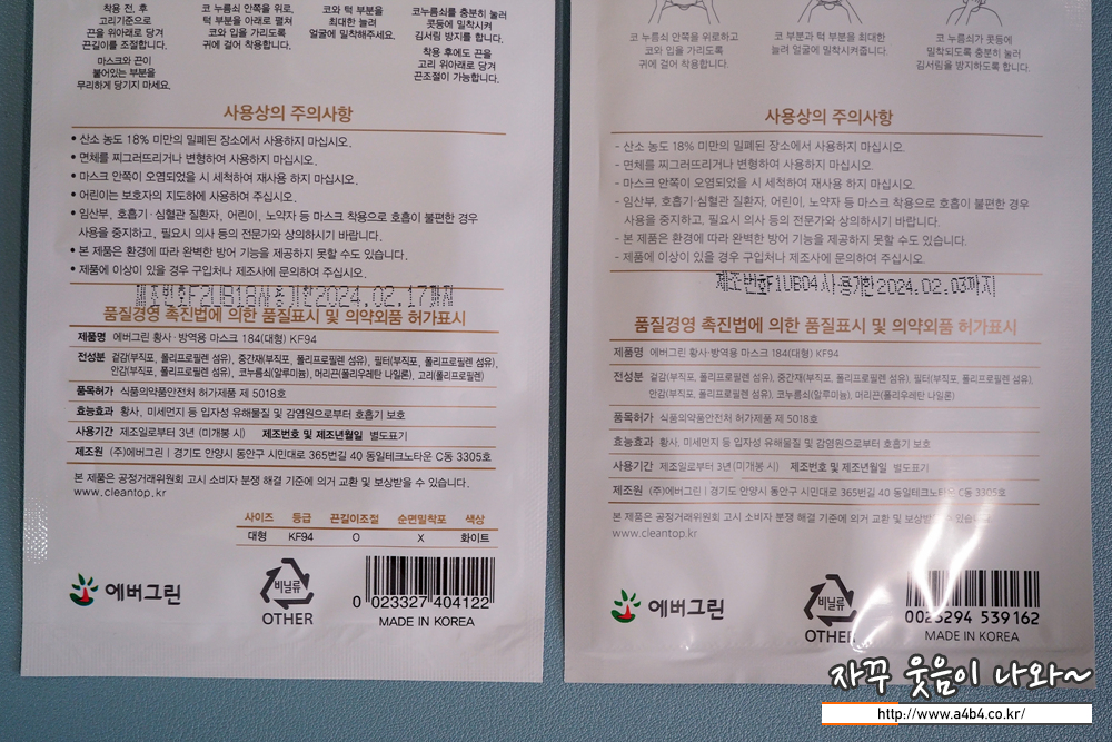 앞에서도 언급했지만 두 제품은 동일한 디자인과 사이즈, 질감, 착용감을 보여주는 마스크입니다.