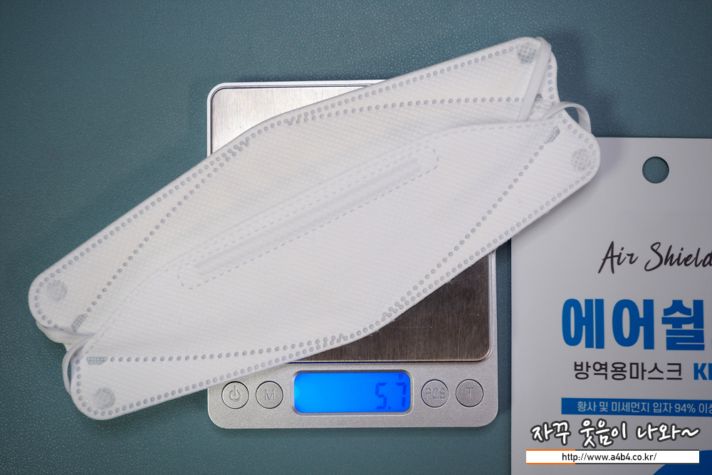 KF94 에어쉴드 마스크 무게는 5.7그램으로 타사 제품에 비해서 무게가 좀 있습니다.