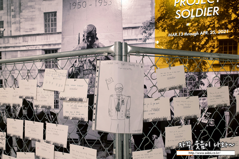 British Korean War Veterans in front of the Korean War Memorial in London. 을 배경으로 한 철조망과 방문자의 편지...