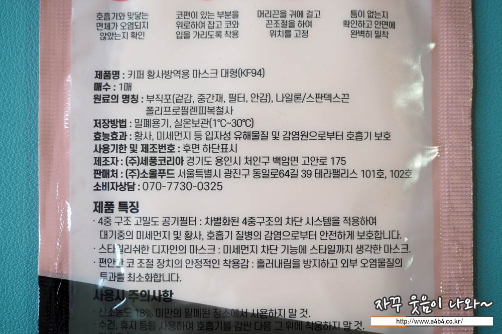 서울사무소 마스크는 4중필터 구조로 조금 두게감이 있는 KF94 마스크입니다. 패턴 처리된 외피는 조금 매끄러운 감촉을 부족 있습니다. 소프트한 타입으로 착용핏이 아주 잘 나오는 제품은 아닙니다.