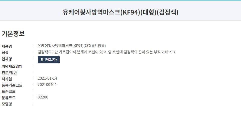 식품의약품안전처 의약품안전나라 등록 명칭은 '유케어황사방역마스크(KF94)'로 검정색 대형사이즈입니다. 올해 1월 허가된 마스크로 제조원은 '유니레즈(주)'로 신생업체 있니다.