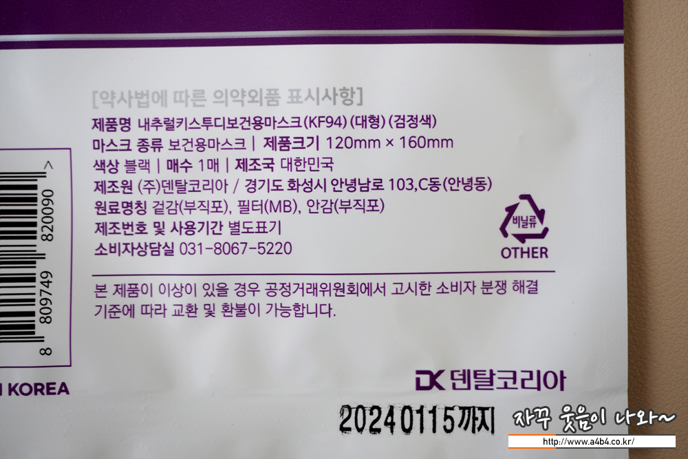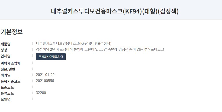 식품의약품 안전처 의약품 안전나라 제품명은 '내추럴키스 투디 보건용마스크' 입니다. KF94 타입 대형사이즈로 올해 1월 허가된 제품입니다. 마스크 제조원은 '주식회사 덴탈코리아'로 '내추럴키스' 이름으로 다양한 타입의 마스크를 생산하는 곳입니다.