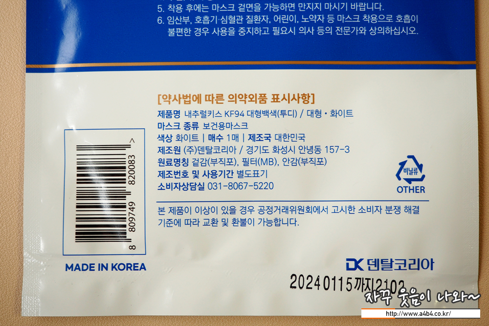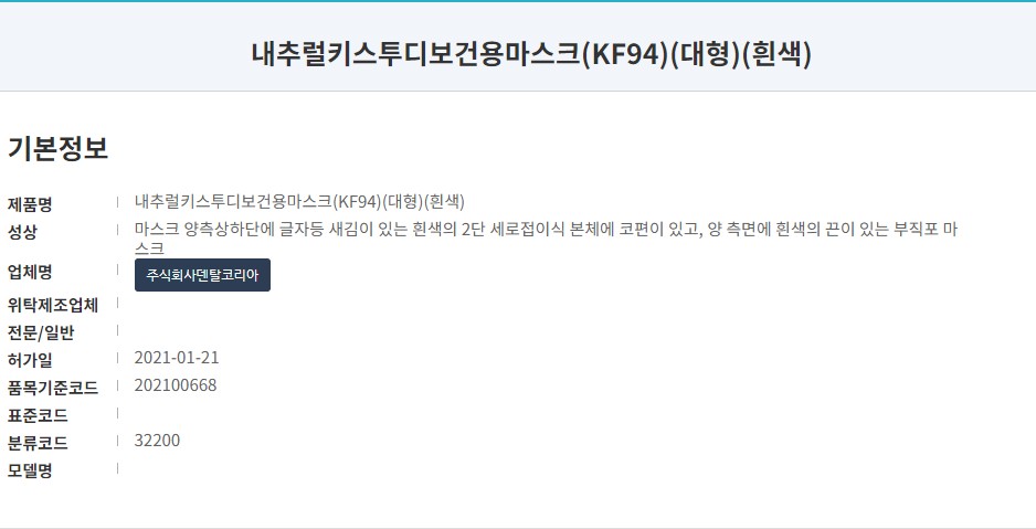 식품의약품안전처 의약품안전나라 등록 제품명은 '내추럴키스투디보건용마스크 (KF94)'입니다. 오늘은 흰색 대형제품으로 마스크 제조사는 주식회사덴탈코리아입니다. 올해 1월 승인된 따끈한 신상 마스크...