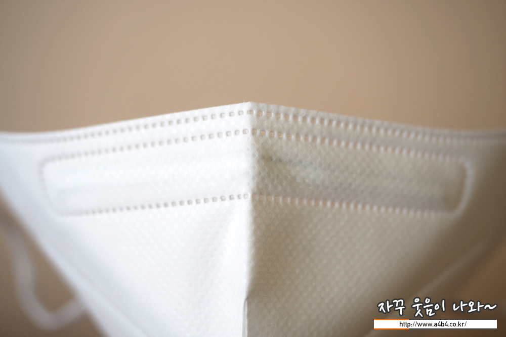 마스크 겉감은 약한 토트퍼리된 부직포가 사용되었으며 감촉은 조금 드라이한 타입입니다. 두께는 얇은 타입이지만 착용감과 착용핏은 하드한 타입입니다. 다만 마스크가 얇다보니 숨은 깊게 쉬면 부직포에서 소리 나면서 들락날락 합니다.