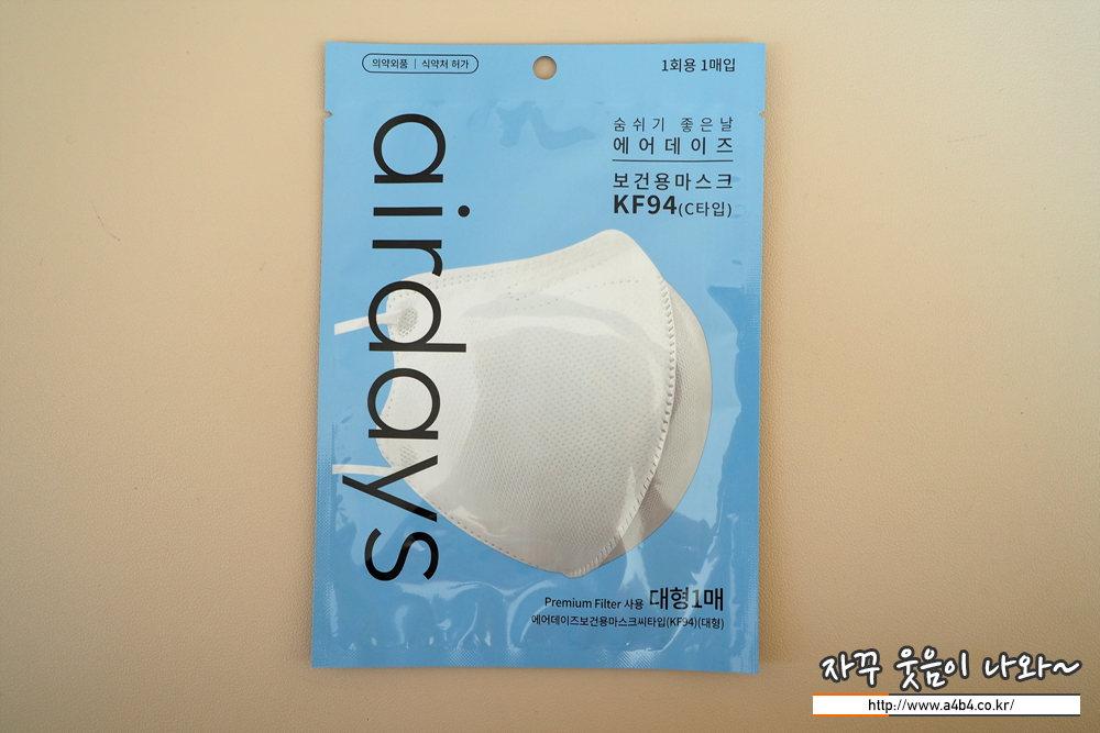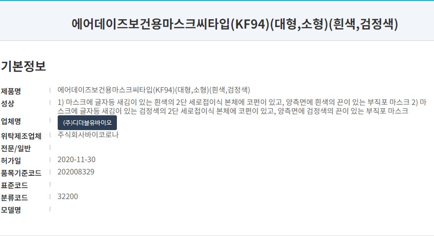 식품의약품안전처 의약품안전나라 등록명칭은 '에어데이즈보건용마스크씨타입 (KF94)'입니다. 흰색 제품으로 최근에는 검정색 제품도 출시 되었습니다. (기회가 되면 블랙 제품도 리뷰를...) 작년 11월 승인된 제품으로 마스크 제조는 '주식회사 바이오코로나' 유통은 'DW바이오'입니다.