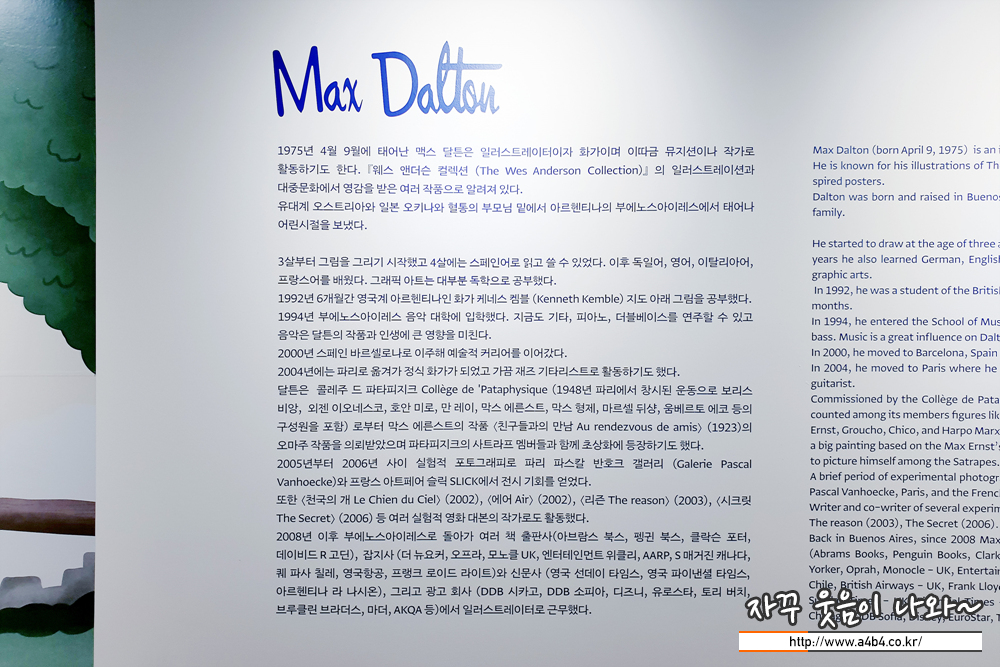 이번 전시는 세계적인 일러스트레이터인 맥스 달튼의 영화와 음악을 소재로 그가 작업한 작품들을 만나볼 수 있는 기회입니다. 특히 알폰스 무하전과 마티즈전, 빅아이 전시회 등을 통해 기획력을 인정받은 마이아트 뮤지엄에서 준비한 전시로 거의 믿고 보는 전시회라고 할까요. (저는 얼리버드 티켓 예약으로 50% 할인을...)