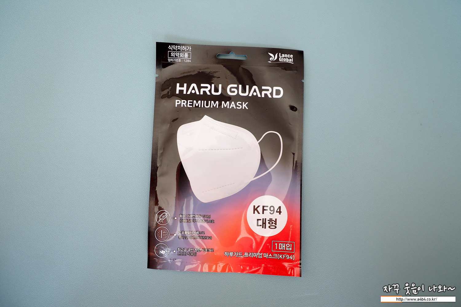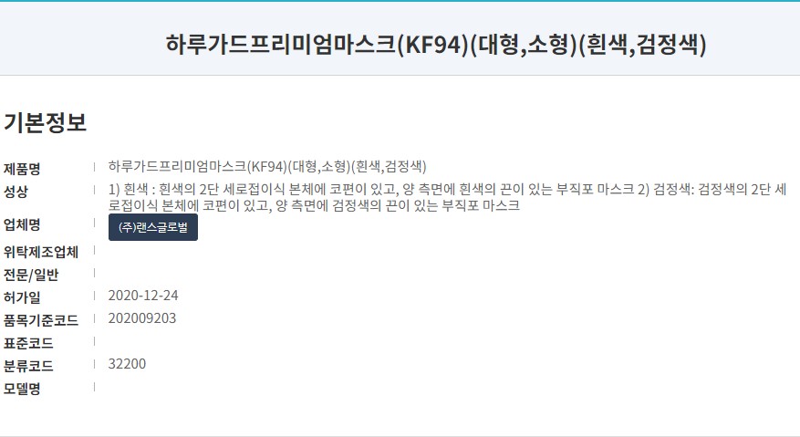 식품의약품안전처 의약품안전나라 등록 제품명은 '하루가드프리미엄마스크(KF94)'로 오늘 리뷰는 블랙색상 대형사이즈 마스크입니다. 작년 12월 승인된 제품으로 마스크 제조사는 '(주)랜스글로벌'입니다.