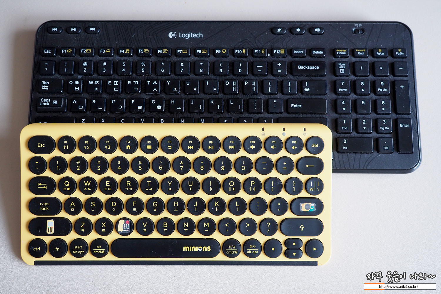 키보드는 한영 한자가 지원되는 표준 타입의 키보드입니다. 오른쪽 숫자패드 부분은 없는 타입으로 숫자 많이 사용하는 분들에겐는 추천하지 않습니다. 아이리버 미니언즈 블루투스 키보는 사무용 보다는 잠깐 잠깐 작업하시는 분들에게 적합한 무선 키보드가 아닐까 합니다.