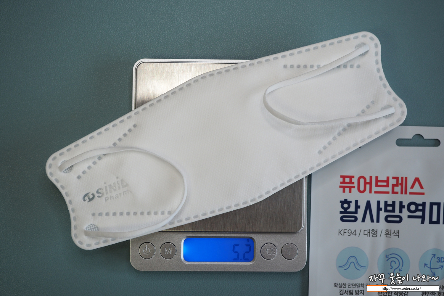 신일제약 퓨어브레스 황사방역 마스크 중량은 5.2그램으로 약간 무게감이 있는 타입의 제품입니다.