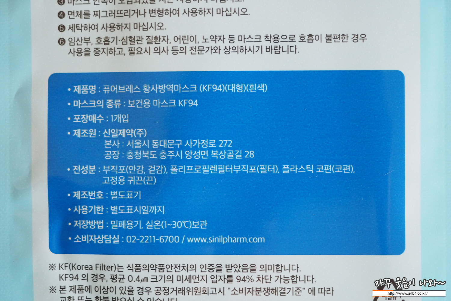 식약처 등록명은 '퓨어브레스 황사방역마스크' 대형입니다. KF94 흰색 마스크로 작년 12월 허가되었습니다. 마스크 제조사는 신일제약으로 홈페이지에는 해당제품정보를 찾지 못했습니다. (제가 못 찾은 것일수도...)