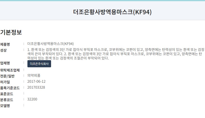 식약처에 등록된 제품명칭은 '더조은 황사방역용마스크 (KF94)'입니다. 2017년 승인된 마스크로 연식이 좀 있는... 마스크 제조사는 더조은주식회사로 '더조은'브랜드로 마스크르 유통하고 있고, 또한 해당 제품으로 이름만 들어도 알만한 회사에 납품하고 있는 업체입니다.