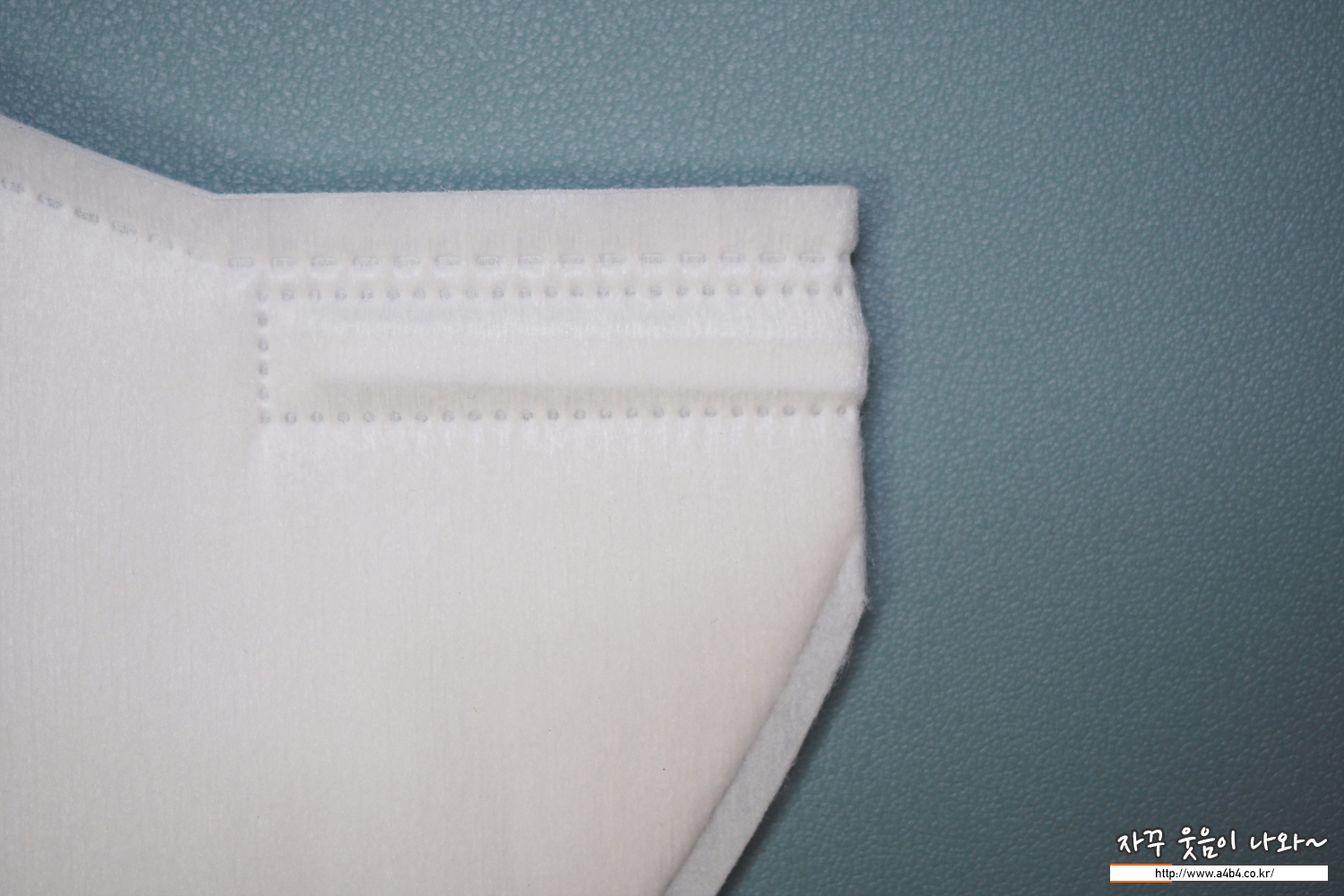 둥근 모양의 귀걸이끈이 마스크 앞에 부착되어 있습니다. 새부리타입 마스크에서 많이 사용되는 칼국수 귀걸이끈이 사용되지 않은 부분은 매우 아쉽네요.