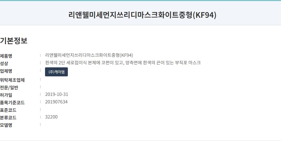식약처 의약품안전나라 제품명은 '리앤웰 미세먼지 쓰리디 마스크' 입니다. 화이트 색상 중형 사이즈로 다른 사이즈 제품은 없습니다. 19년 10월 승인된 마스크로 마스크 제조사는 주식회사 케이엠입니다. 판매원은 (주)나옴케어로 안내되어 있습니다.