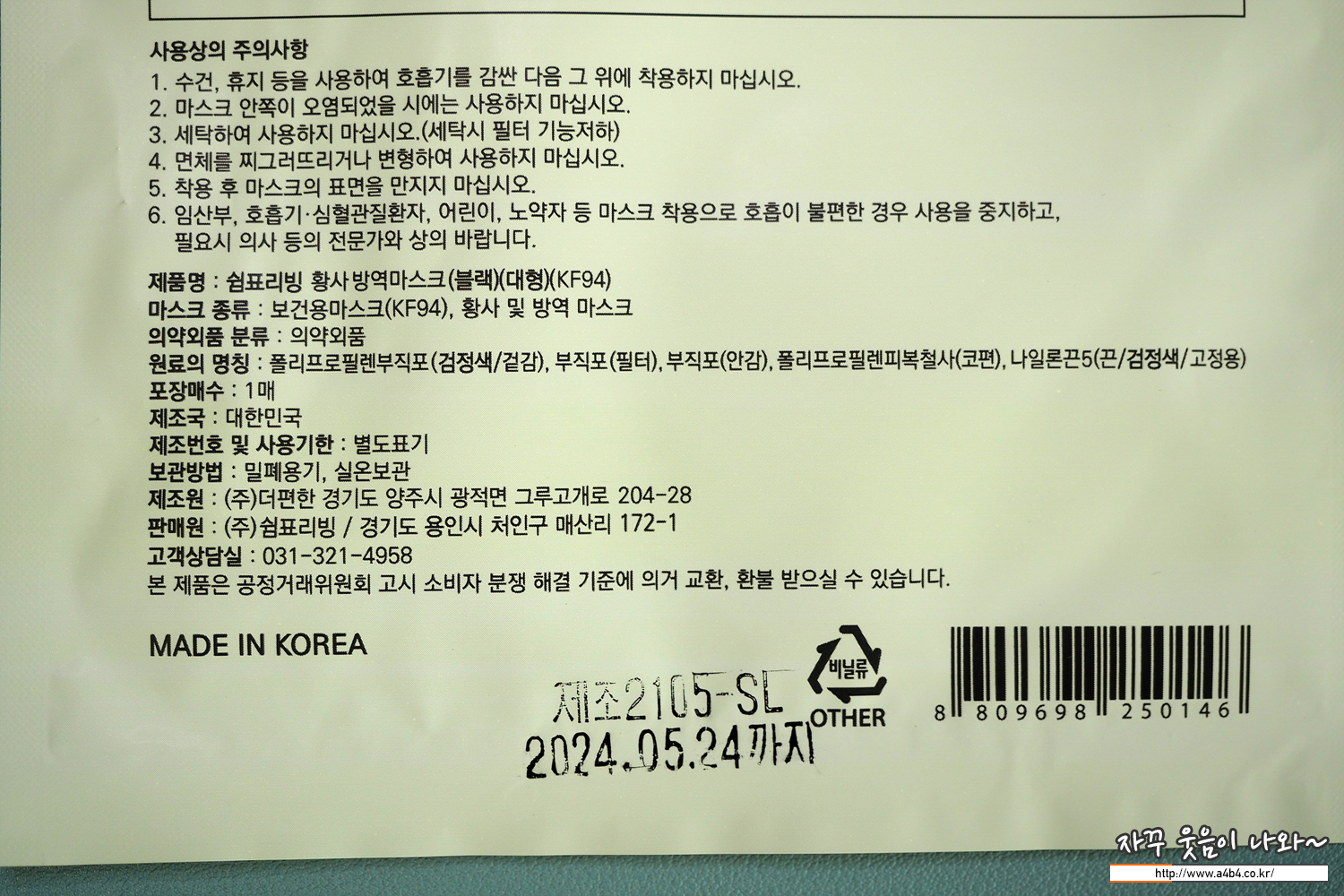 식약처 등록 제품명칭은 '쉼표리빙 황사방역마스크'로 블랙과 화이트 그레이 색상이 있는 제품입니다. 오늘은 KF94 대형 블랙색상으로 리뷰진행합니다. 마스크 제조사는 주식회사 더편한으로 2019년 허가된 제품입니다.