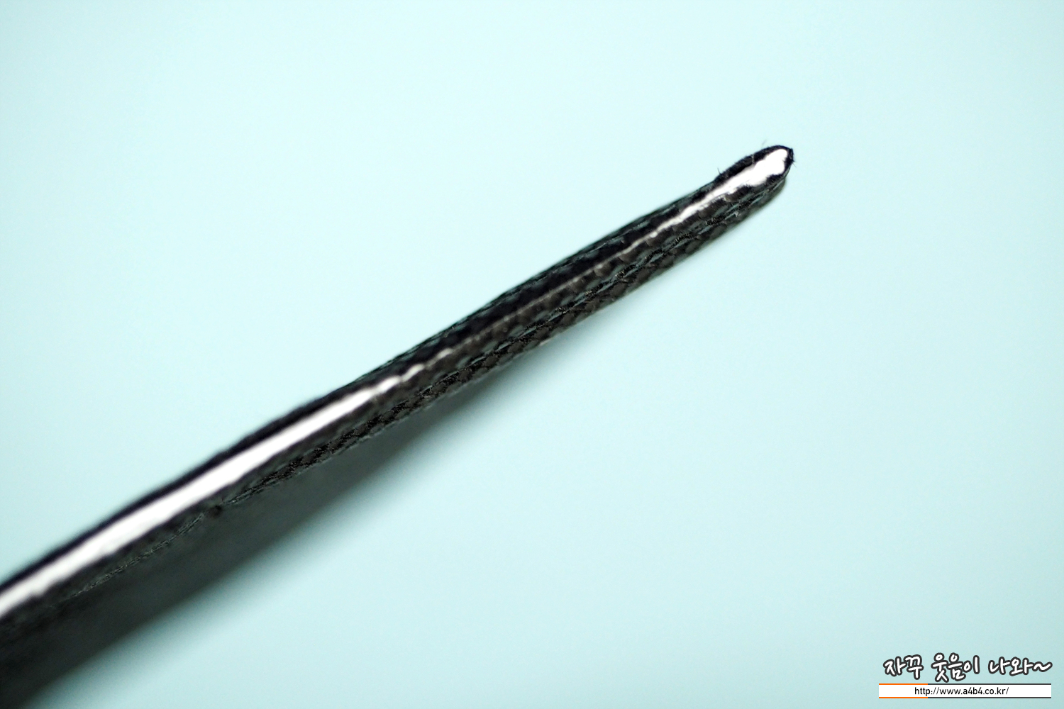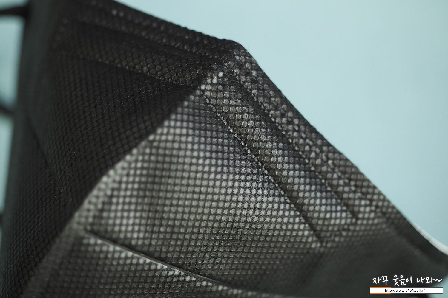 쉼표리빙 마스크 외피는 패턴 처리된 유광블랙 발색을 보입니다. 조명에 따라 반사가 조금 있는 제품입니다.