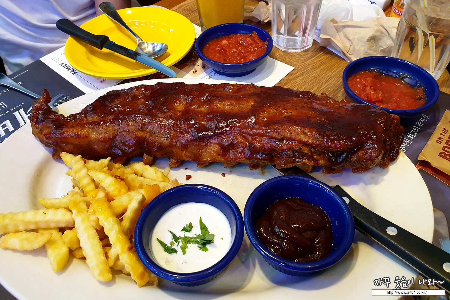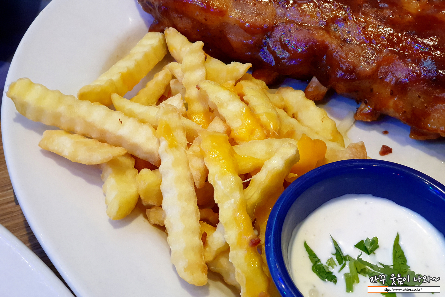 온더보더 바베큐 폭립은 통감자와 프렌치 프라이 중 하나를 사이드로 선택 가능합니다.
