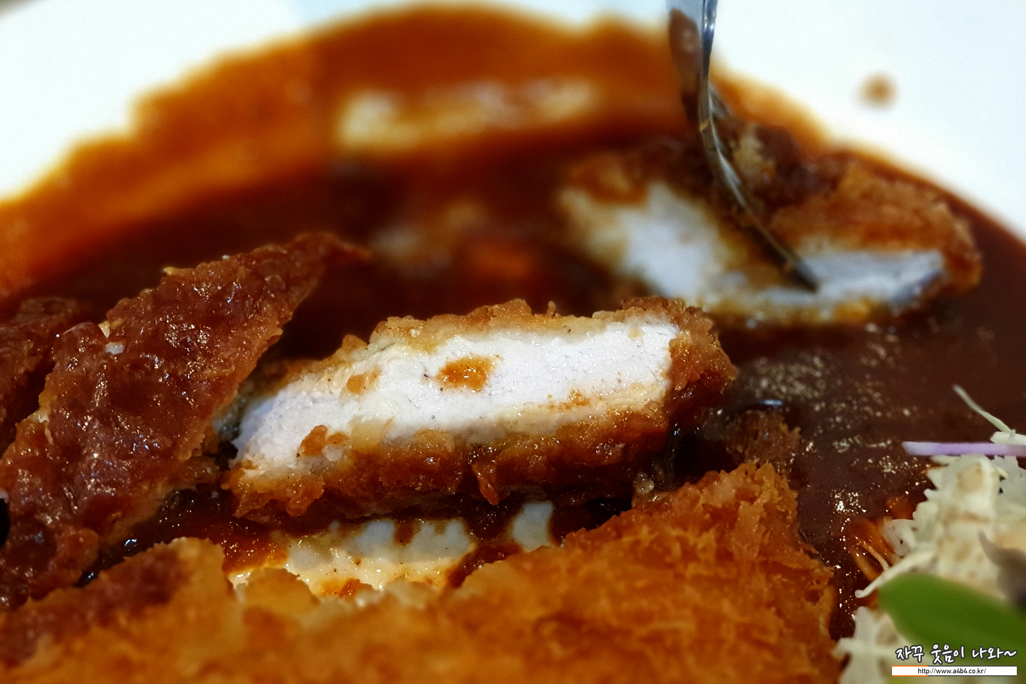 등심 돈까스답게 쫄깃한 식감을 보여줍니다. 돈까스 소스는 일반적인 옛날 돈까스 소스를 생각하면 됩니다. 양은 상당히 많네요. 먹보가 먹기에도 충분한 양을 보여줍니다.