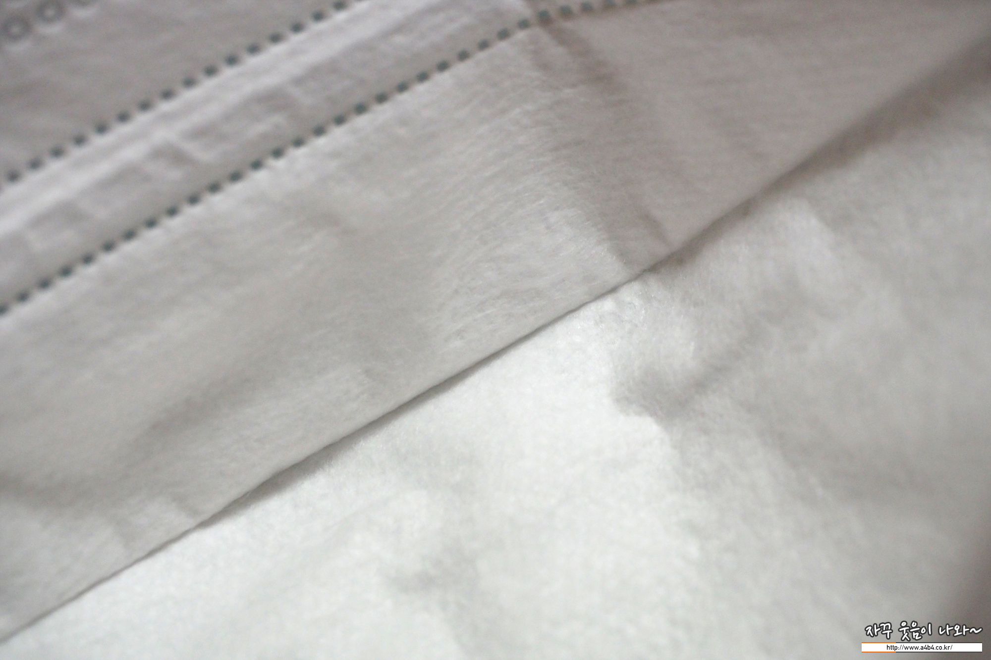 마스크 내피는 드라이한 감촉을 보입니다. 하루종일 착용해도 내피에 보푸라기는 일어나지 않으며, 얼굴이 가렵거나 간지러운 문제점도 생기지 않았습니다. 다만, 얇고 소프트한 타입으로 숨을 쉬면 내피와 입 접촉이 빈빈하게 생깁니다.