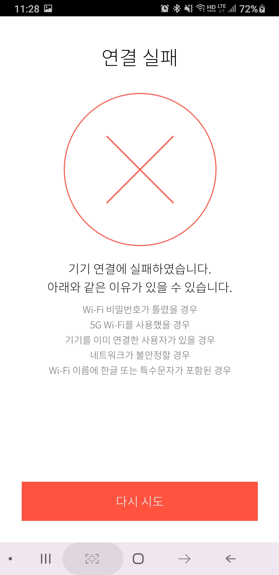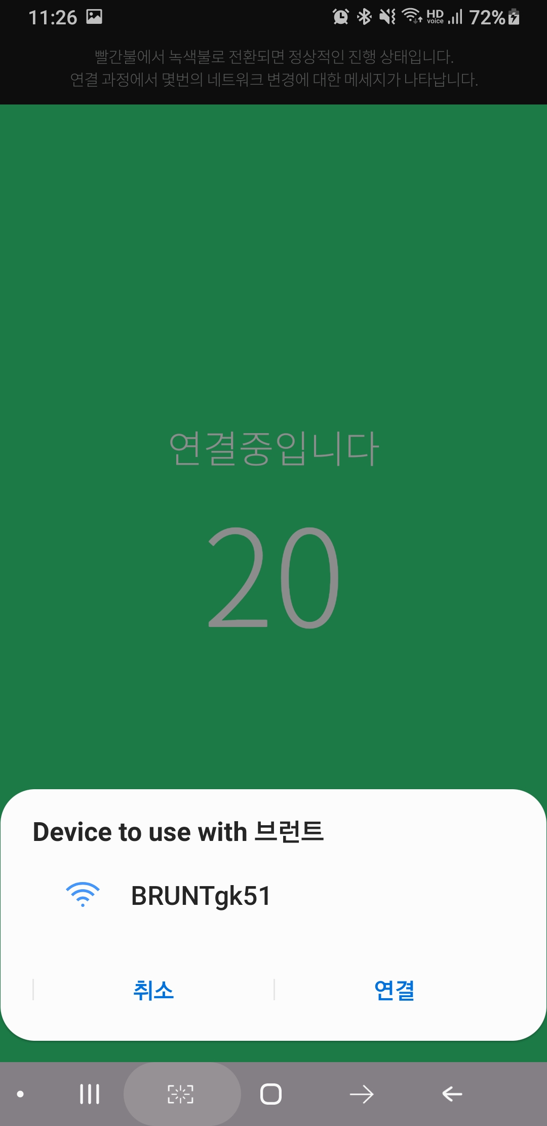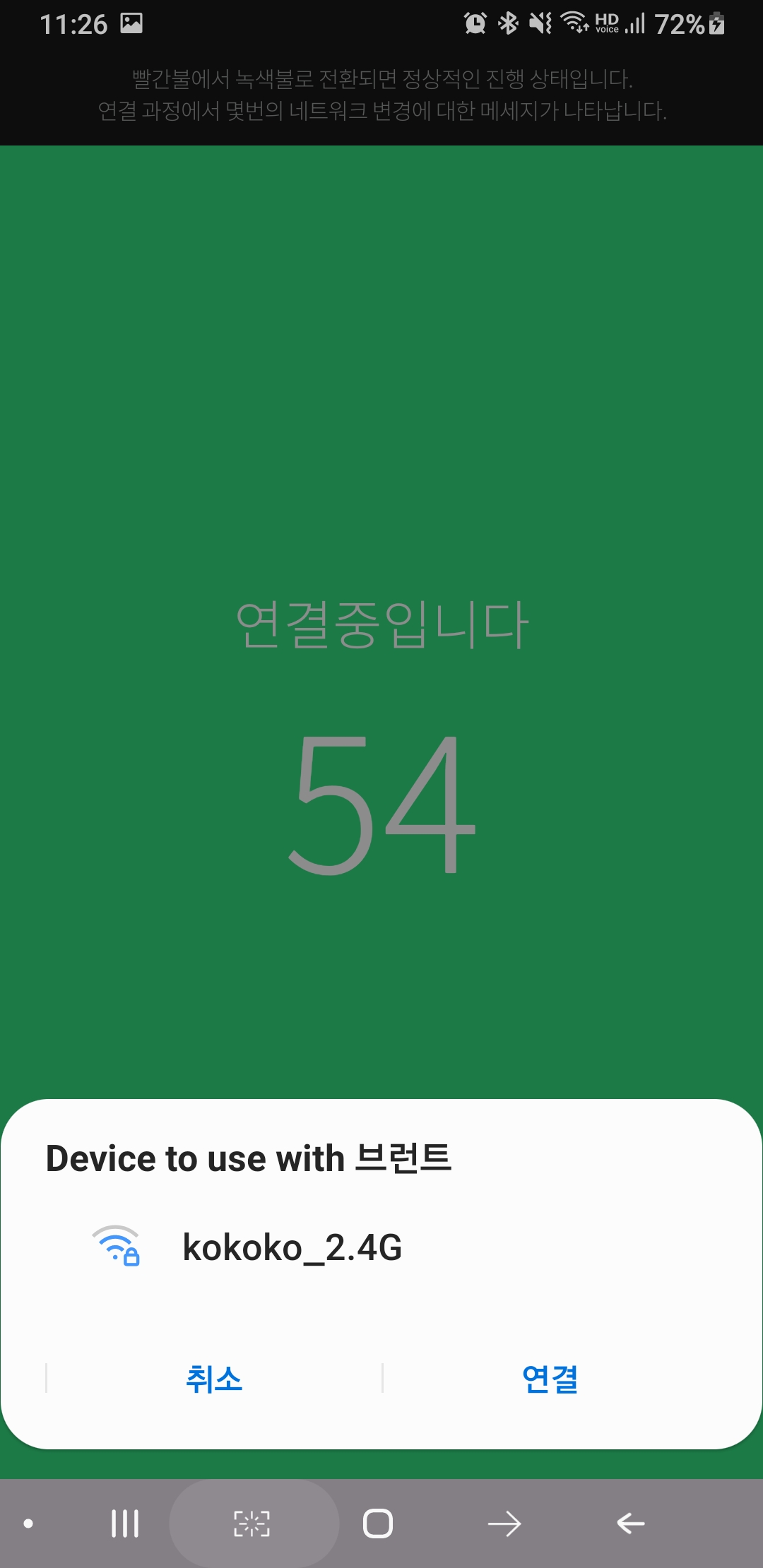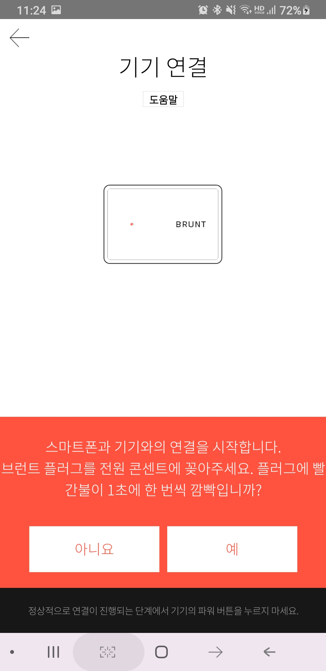 앱을 설치하고, 브런트 기기 초기화 하고 연결시도 및 2.4G 와이파이 연결하고 순조롭게 진행되는 것 같지만...