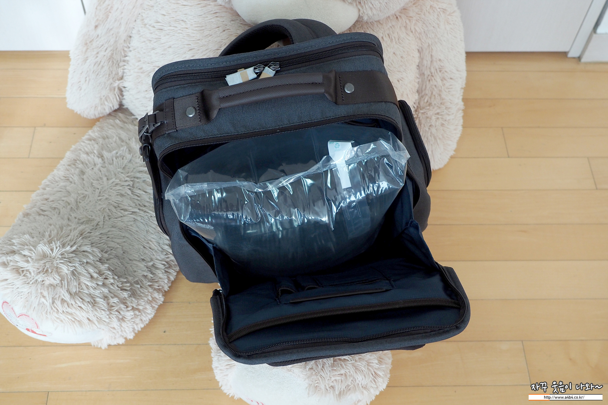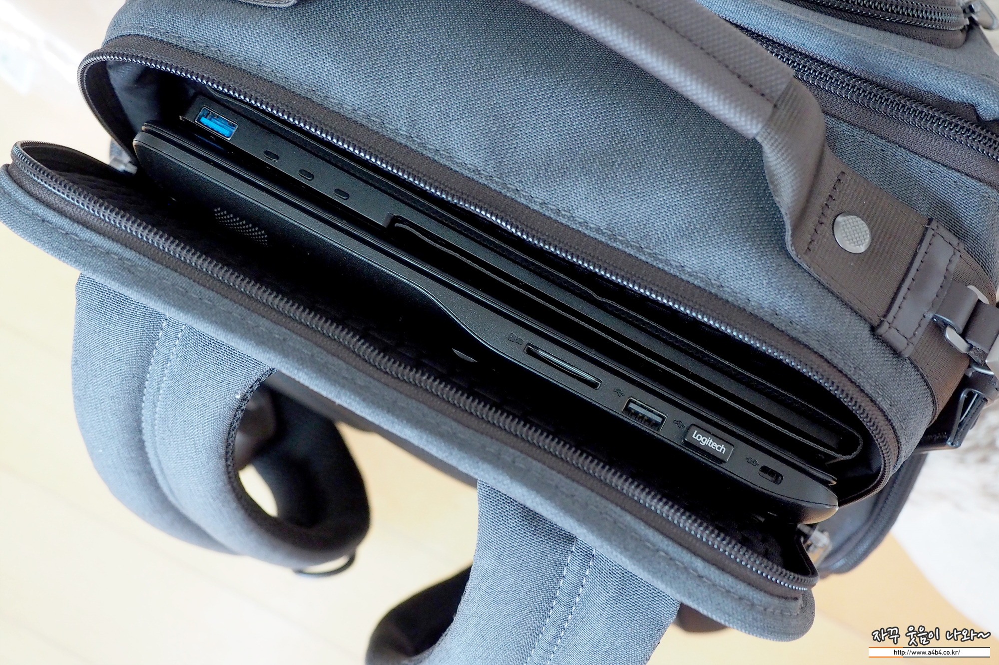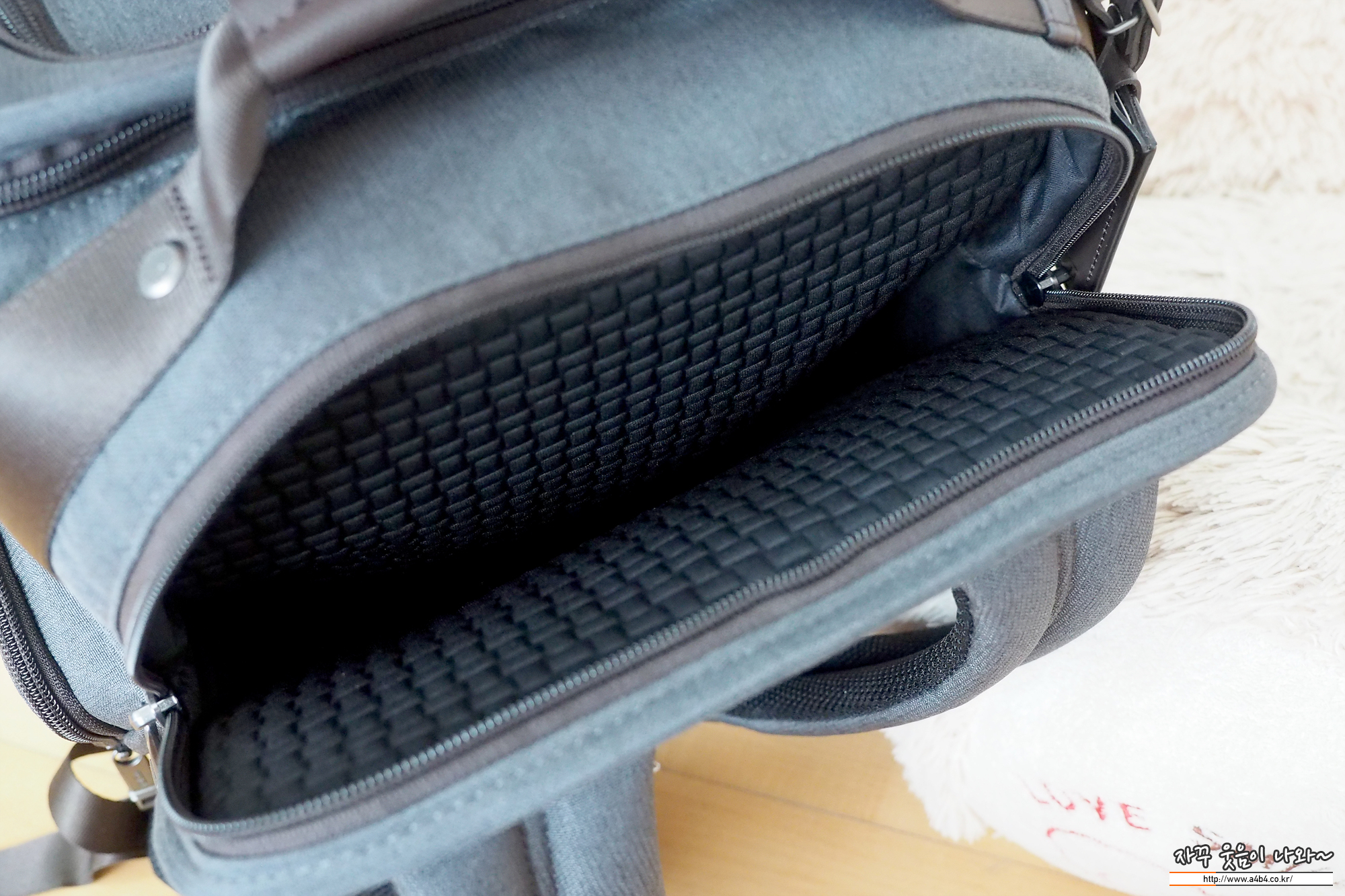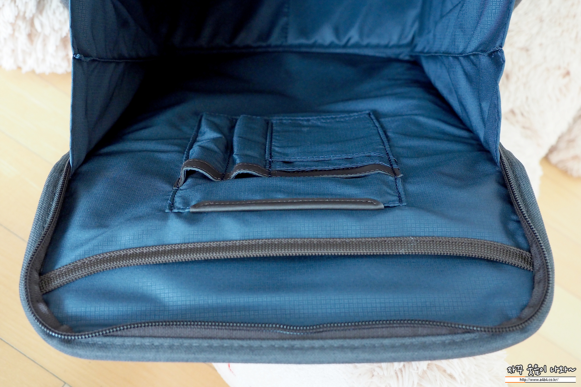 노트북 수납공간은 상당히 안정되 보입니다. 푹신한 안쪽 공간과 매뉴얼에는 15인치 노트북 수납이 가능하다고 표시되어 있습니다. 삼성 시리즈5 15인치 노트북과 15인치 휴대용 듀얼 어니터를 넣어도 넉넉한 공간이 보입니다. 아마도 베젤리스 슬림형 노트북의 경우 17인치도 수용 가능해 보입니다.
