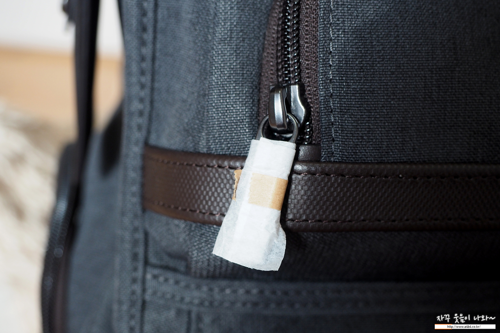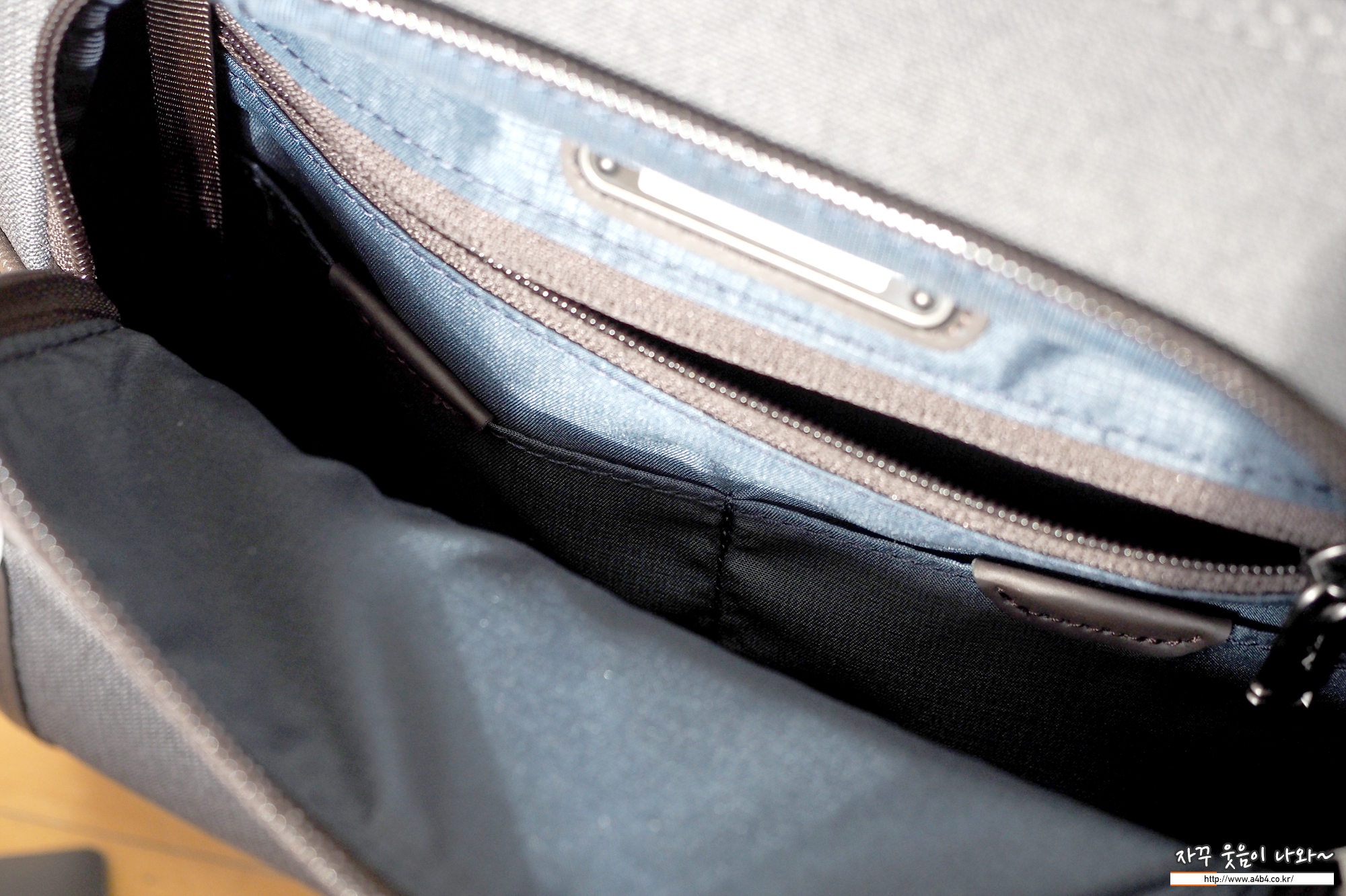 아래에는 두 개의 수납공간이 있으며, 맨 하단은 가죽이 지퍼를 덮는 방식으로 지퍼 열기 힘듭니다. 약간의 귀중품 보관하기에 알맞아 보이네요.